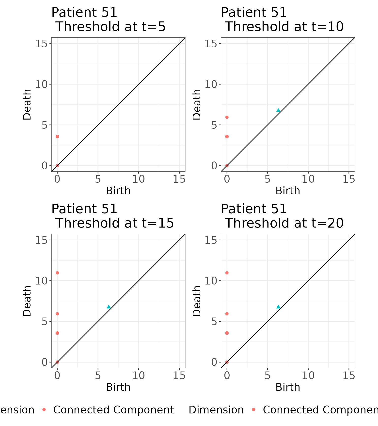 To detect and quantify the size these homologies, we use a summary statistic known as a persistence diagram. The persistence diagram summarizes the number and size of connected components and loops. We will illustrate examples of persistence diagrams below.