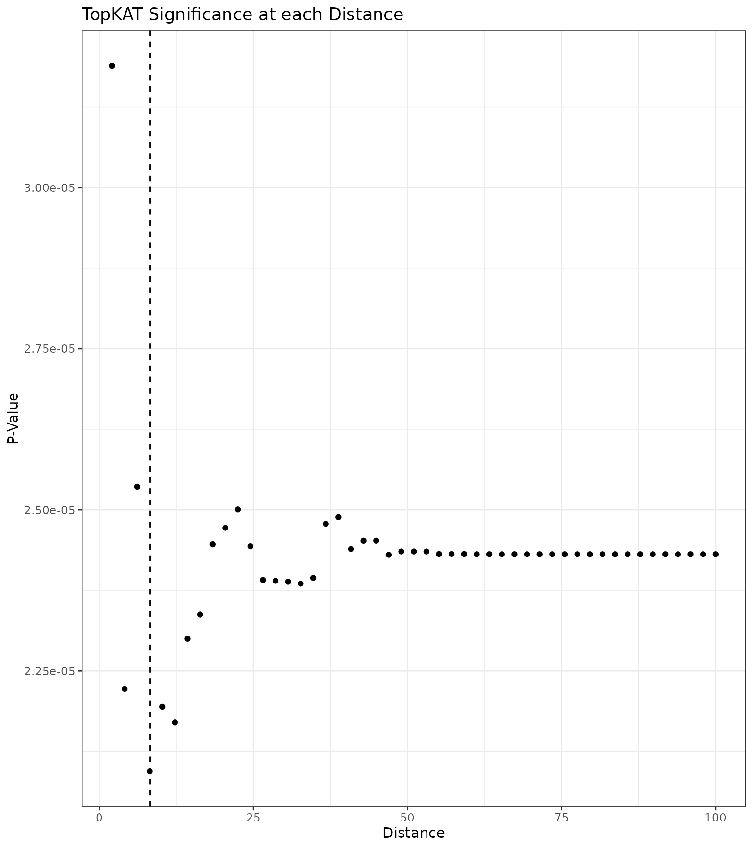 outcome.type = "survival")We first examine the sequence of p-values at each distance The distance at which the minimum TopKAT p-value arose was .